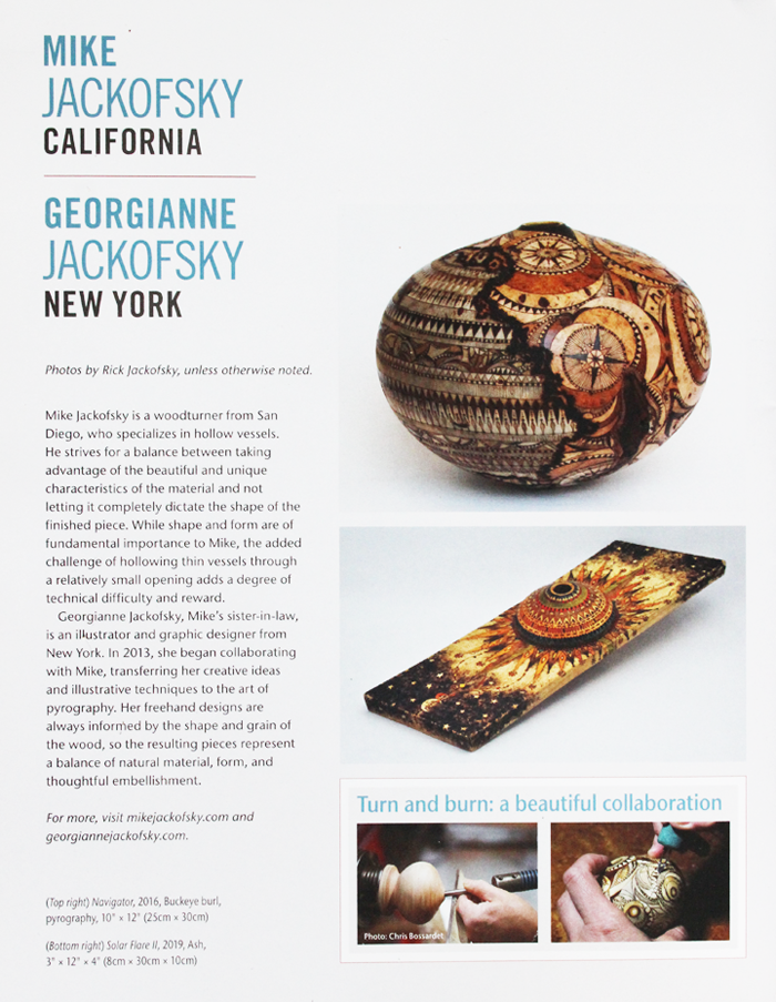 and sculptural forms. ![]() ![]() Mike with master craftsman Sam Maloof " Mike is one of the most talented woodturners.....I recommend his work very highly" - Sam Maloof 2008 "Mike Jackofsky specializes in making hollow forms, wood vessels that are carved out on the inside. Many of his pieces are made from unique burls, accentuating their irregular grains and distinctive characteristics . . . It is very rare to see a turned wood vessel in the scale that he produces. Equally amazing is the weight - even the largest piece might not register on a scale. Mike has won numerous awards for his turning and is a sought-after speaker, instructor and mentor." -- Trios Gallery ![]() ![]() Mike's work was featured on the cover of Craft Suppy USA Woodturners Catalog in 2010. In 2016 his hollow forms with pyrographic designs by Georgianne Jackofsky were featured. Mike and Georgianne's work was